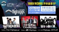 The Flickersら出演 <HighApps Vol.21 踊るロック×HighApps>ライブの生配信決定 明日7 月15日にタワーレコード渋谷店B1のCUTUP STUDIOにて行われる、タワーレコードの人気キャンペーン<踊るロック>とHIP LAND MUSICがプロデュースするライブイベントシリーズ<HighApps>によるコラボレーションイベント、<HighApps Vol.21 踊るロック×HighApps>の生配信が決定した。